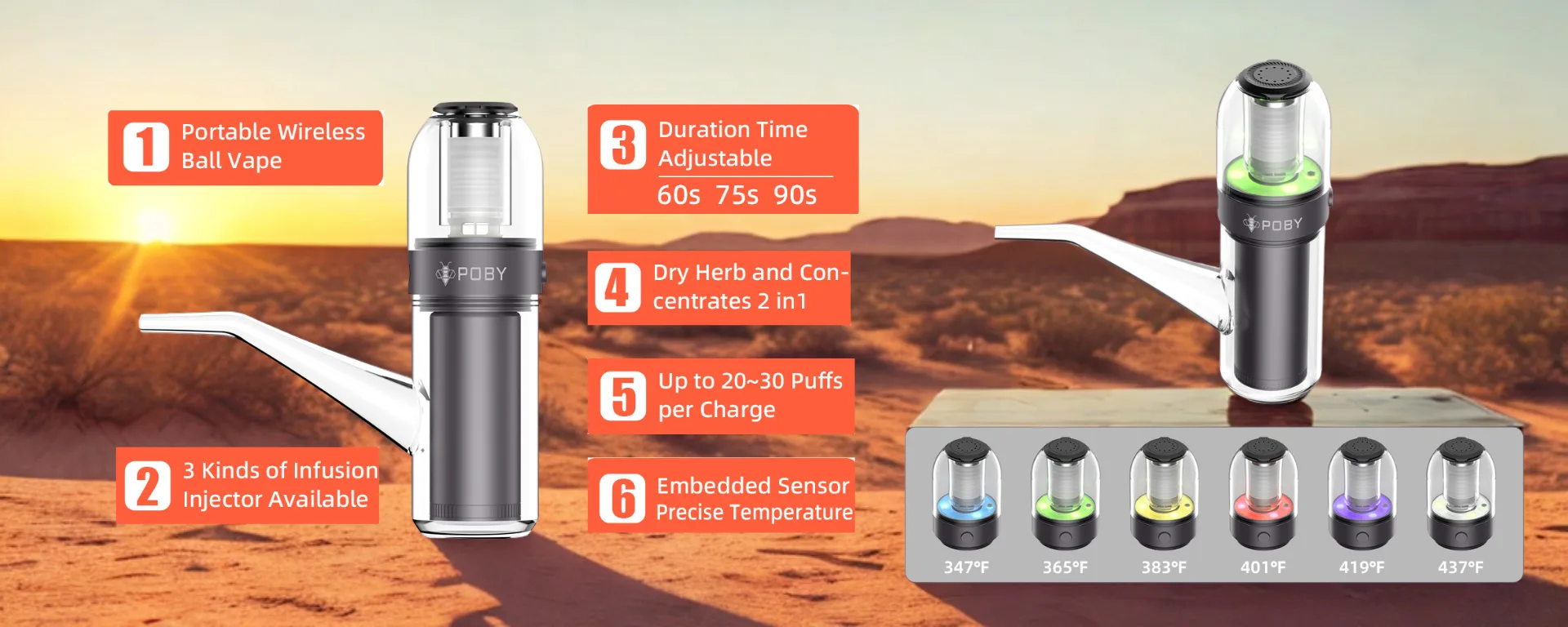 Poby Ember is a compact ball vape designed for on-the-go sessions. It uses 2mm terp pearls for efficient heat distribution and smooth, flavorful hits. With precise temperature control, portable design, and consistent performance.