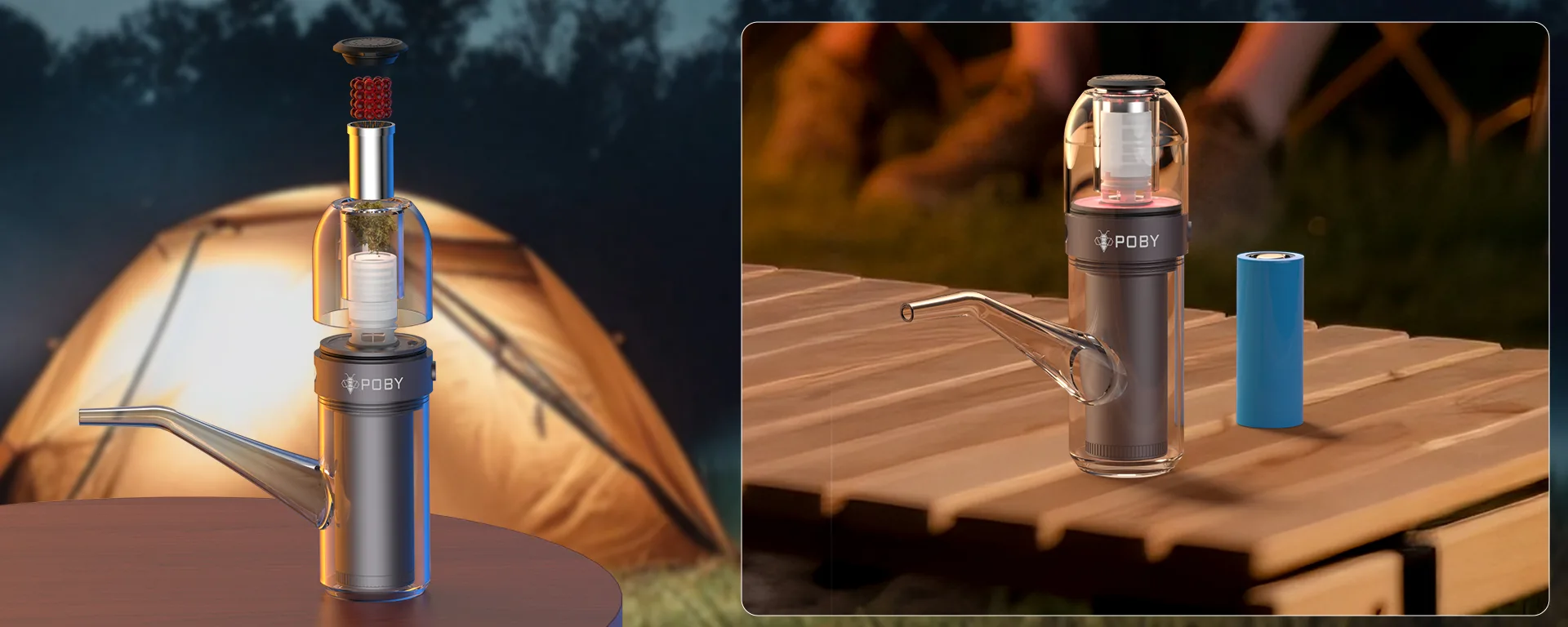 It shares the same battery and glass base as the Poby L E-Rig, so you only need a Poby concentrate heater, a glass dome, and a ball cap to use it for dabbing concentrates.